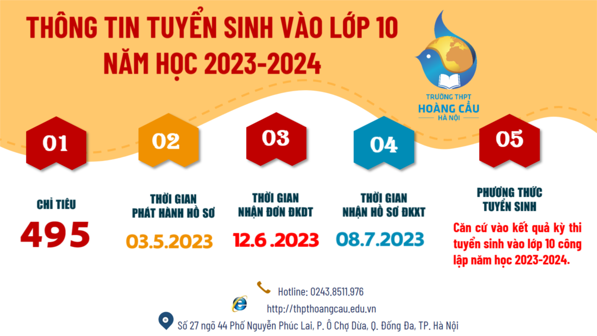 Kính gửi quý Phụ huynh và các em học sinh 2K8 những thông tin chính của Kì tuyển sinh vào lớp 10 năm học 2023-2024 của trường THPT Hoàng Cầu.