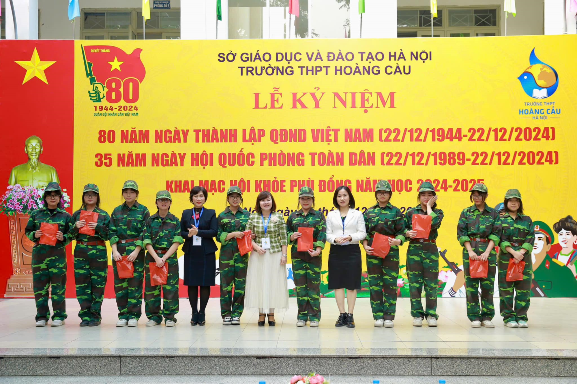 Ngày 21/12/2024, trường THPT Hoàng Cầu đã long trọng tổ chức Lễ kỷ niệm 80 năm ngày thành lập Quân đội Nhân dân Việt Nam (22/12/1944 - 22/12/2024) và 35 năm Ngày hội Quốc phòng toàn dân (1989-2024). Buổi lễ nhằm tri ân các thế hệ anh hùng quân đội, đồng thời giáo dục học sinh về lòng yêu nước và trách nhiệm với quê hương.