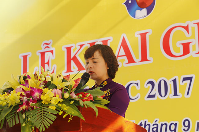 Cô giáo Lưu Thị Lập - Bí thư chi bộ - Hiệu trưởng nhà trường đọc lời tuyên bố khai giảng năm học 2017-2018