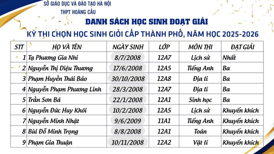 Kỳ thi Học sinh giỏi Thành phố Hà Nội năm học 2025–2026 tiếp tục ghi dấu ấn rực rỡ của thầy và trò trường THPT Hoàng Cầu với thành tích cao nhất từ trước tới nay, cả về số lượng lẫn chất lượng giải thưởng.