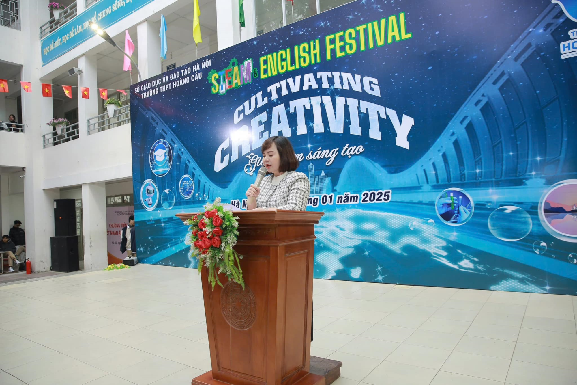 Trong không khí hân hoan của những ngày đầu năm mới 2025, trường THPT Hoàng Cầu đã long trọng tổ chức Ngày hội STEAM & ENGLISH FESTIVAL với chủ đề “Cultivating creativity – Gieo mầm sáng tạo” với những khách mời đặc biệt: Thầy giáo Hà Lam Sơn- Chuyên viên phòng Trh Sở GD&ĐT Hà Nội và các bậc PHHS. Đây là một sự kiện quan trọng, nhằm khơi dậy niềm đam mê nghiên cứu khoa học và sáng tạo trong học sinh, đồng thời góp phần xây dựng môi trường học tập đổi mới, đáp ứng xu thế giáo dục hiện đại toàn cầu.
