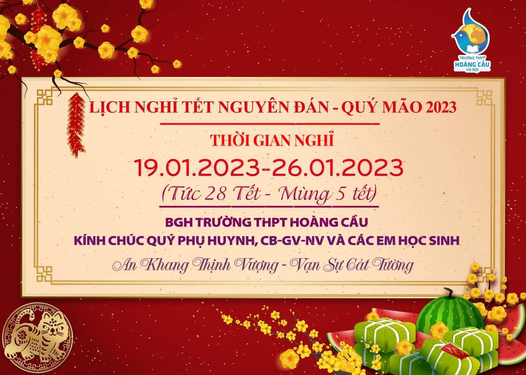 Căn cứ công văn hướng dẫn của Sở GD&ĐT Hà Nội về việc nghỉ Tết nguyên đán Quý Mão 2023 đối với CB-GV-NV và học sinh, trường THPT Hoàng Cầu xin thông báo về thời gian nghỉ Tết như sau: