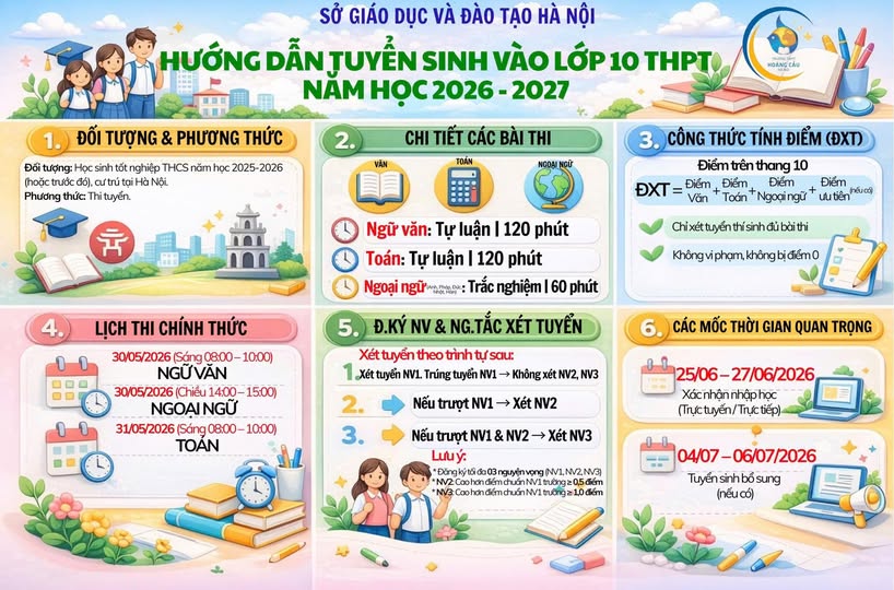 Năm học 2026-2027, trường THPT Hoàng Cầu tuyển sinh lớp 10 theo quy định của Sở giáo dục và đào tạo Hà Nội dành cho các trường công lập. Chính vì vậy, nhà trường gửi các bậc phụ huynh và các em học sinh những điều cần biết và các mốc thời gian của kì tuyển sinh năm nay.