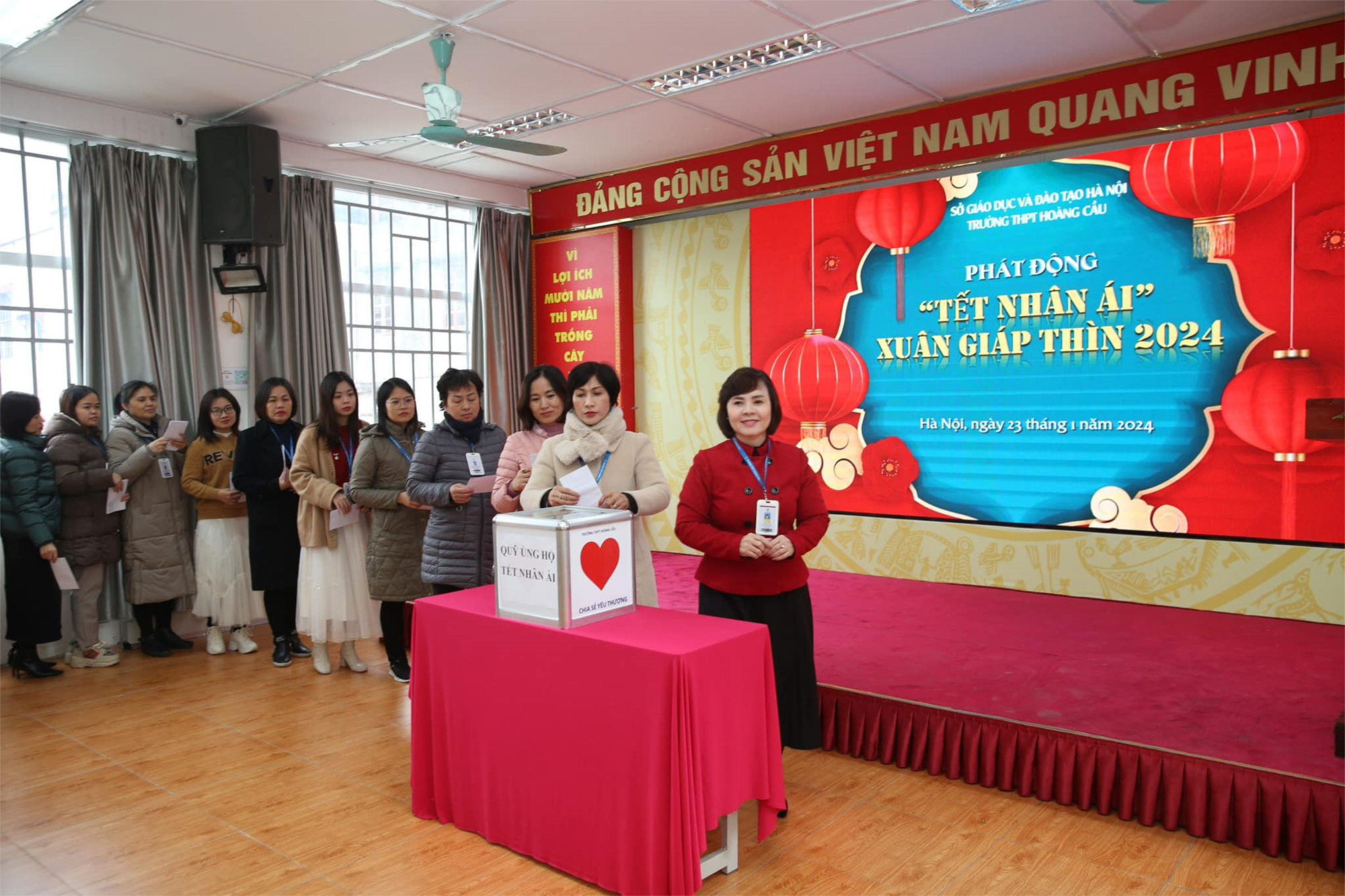 Thực hiện công văn chỉ đạo của Hội chữ thập đỏ quận Đống Đa và kế hoạch từ thiện nhân đạo năm học 2023-2024, trường THPT Hoàng Cầu đã phát động gây quỹ “Tết nhân ái Xuân Giáp Thìn năm 2024” đến 100% cán bộ, giáo viên, nhân viên và học sinh nhà trường.